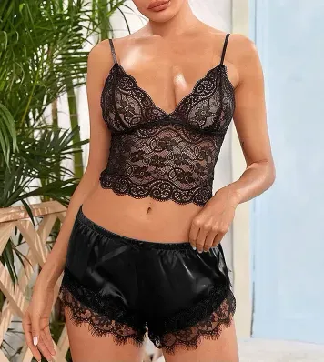 Descubre la combinación perfecta entre elegancia y comodidad con este conjunto de pijamas de encaje para mujer. Diseñado en un delicado encaje transparente, este conjunto de dos piezas incluye un top con tirantes ajustables y pantalones cortos a juego, ideal para sentirte femenina y cómoda a la vez....